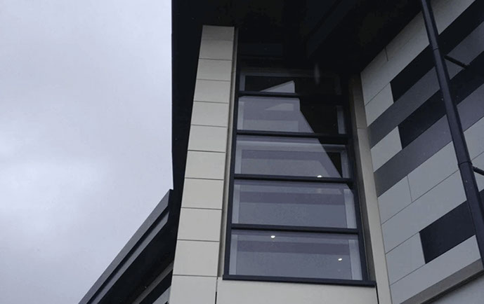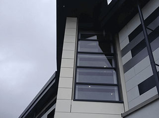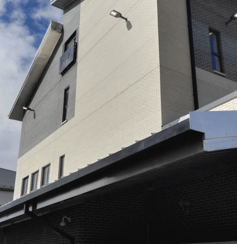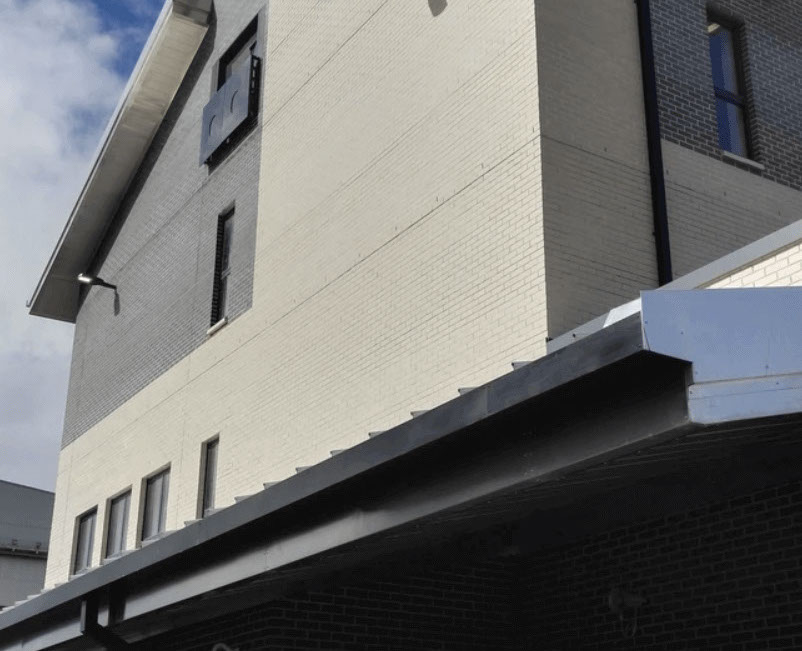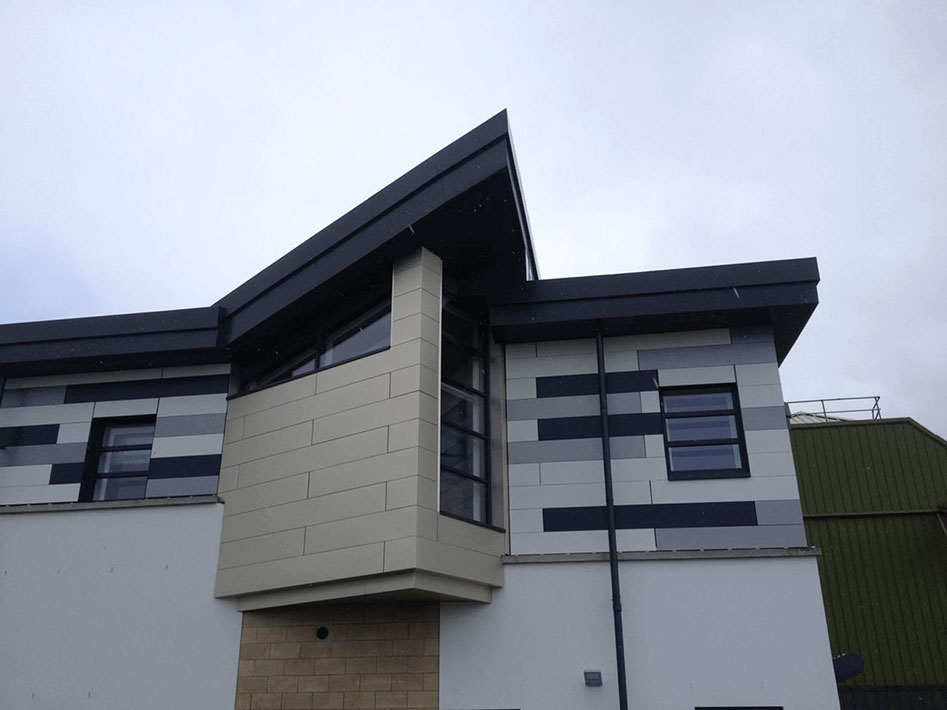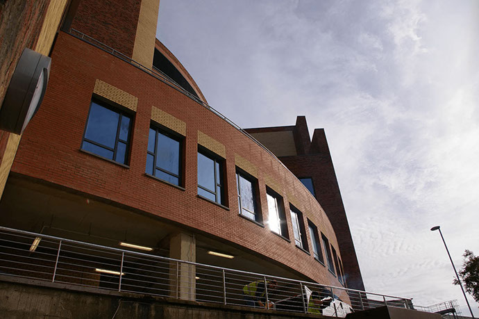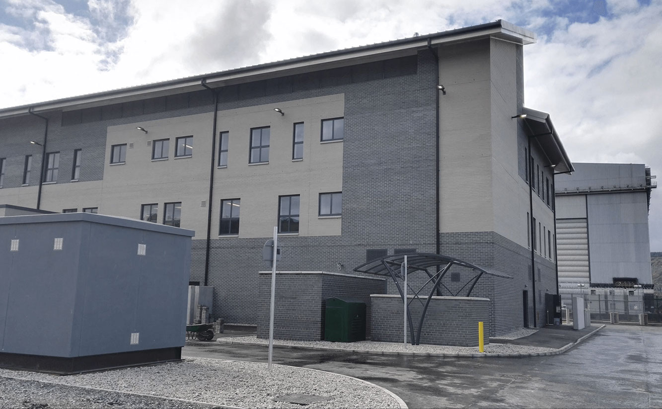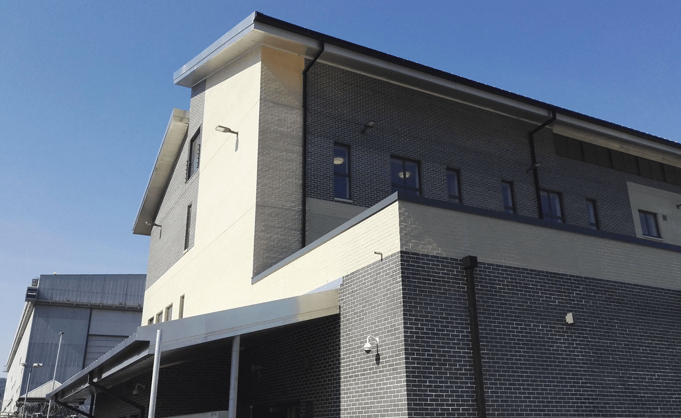 The design features a strong mono-pitched roof form utilising aluminium standing seam roof cladding and facing bricks in two shades of grey. Unusually the building as no ground floor windows but includes concrete chicanes to gain building access and ballistic doors and barriers placed at high level, both for defensive and combat functionality. Otherwise the building is a conventional steel frame protected with intumescent paint, masonry cavity walls with the outer leaf supported on shelf angles at every floor and thermal insulation within the cavity and on the inner surface wall lining.
