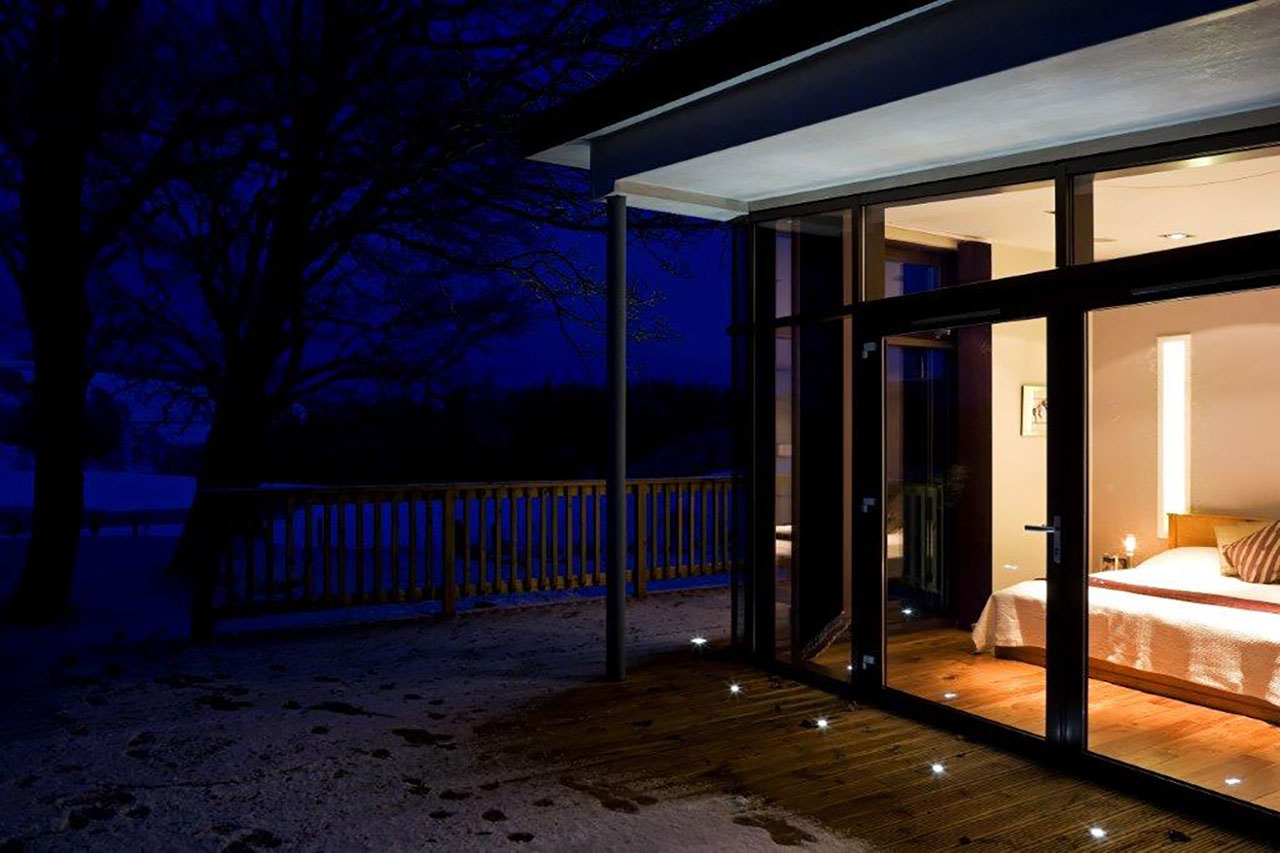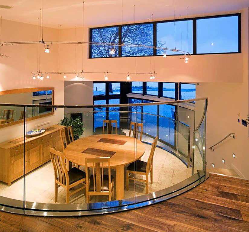 Following demolition of a small stone outhouse, the site presented itself as a series of natural terraces which appeared to flow from the house, generating a beautiful natural rhythm. The organic plan for the extension follows these natural contours, with a radial stair, generated by the circular dining room, giving access to 3 levels – master bedroom, dining, and lower lounge. With the exception of the master bedroom suite, which is located discretely, with its own private terrace looking directly to Downhill, all other accommodation is open plan. The lower lounge incorporates 3 curved fully glazed doors which slide away within a wall recess to create a 3m wide opening giving access to a large south facing terrace in the lower garden. The quality of both terraces is enhanced by the consistency of floor finishes – inside and out, incorporating recessed spotlights to extend the illusion of transparency.