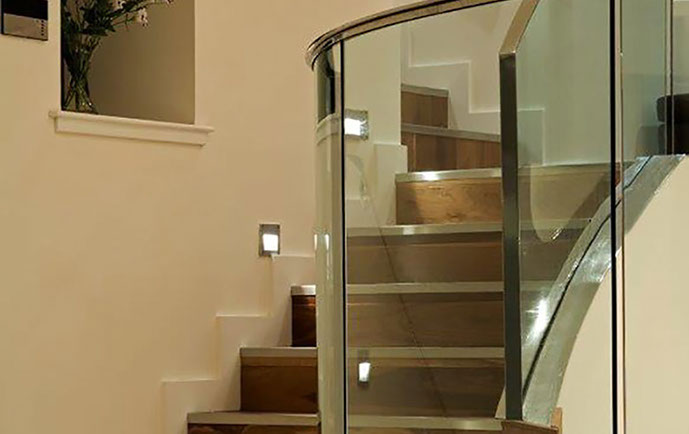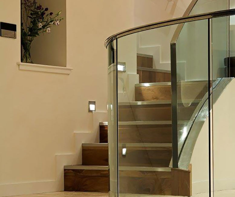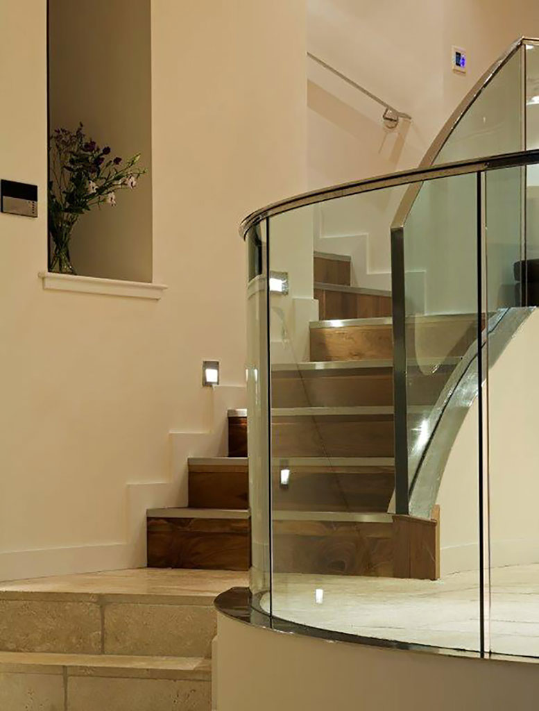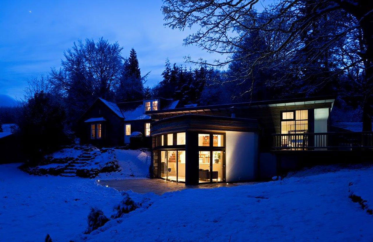 Following demolition of a small stone outhouse, the site presented itself as a series of natural terraces which appeared to flow from the house, generating a beautiful natural rhythm. The organic plan for the extension follows these natural contours, with a radial stair, generated by the circular dining room, giving access to 3 levels – master bedroom, dining, and lower lounge. With the exception of the master bedroom suite, which is located discretely, with its own private terrace looking directly to Downhill, all other accommodation is open plan. The lower lounge incorporates 3 curved fully glazed doors which slide away within a wall recess to create a 3m wide opening giving access to a large south facing terrace in the lower garden. The quality of both terraces is enhanced by the consistency of floor finishes – inside and out, incorporating recessed spotlights to extend the illusion of transparency..