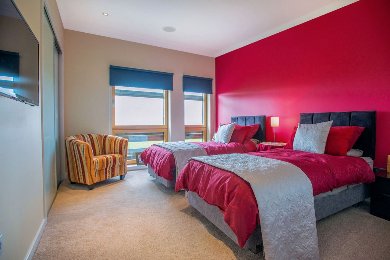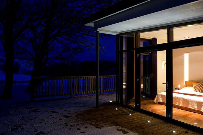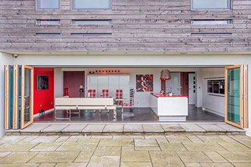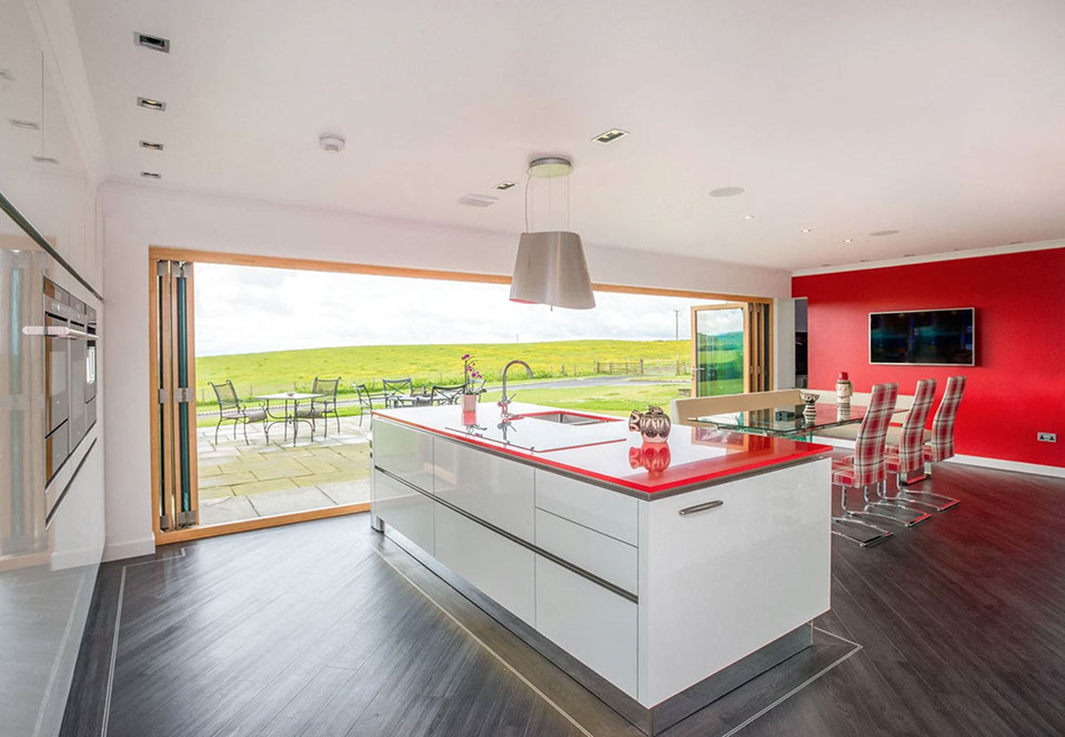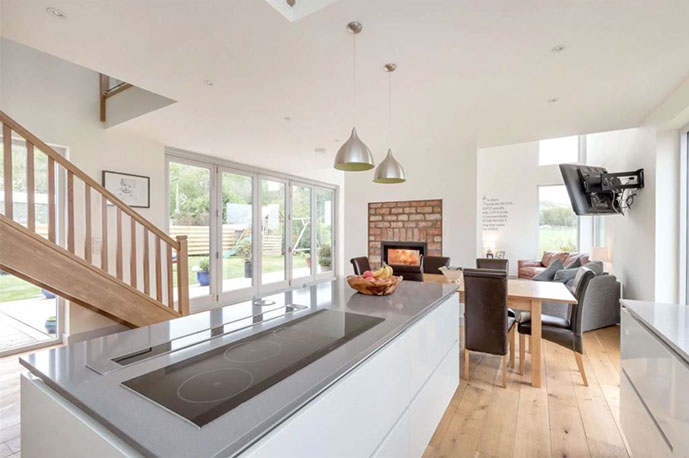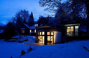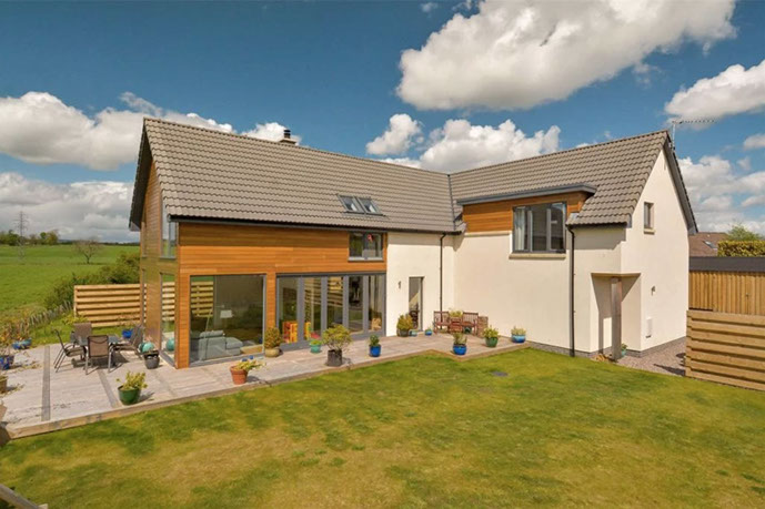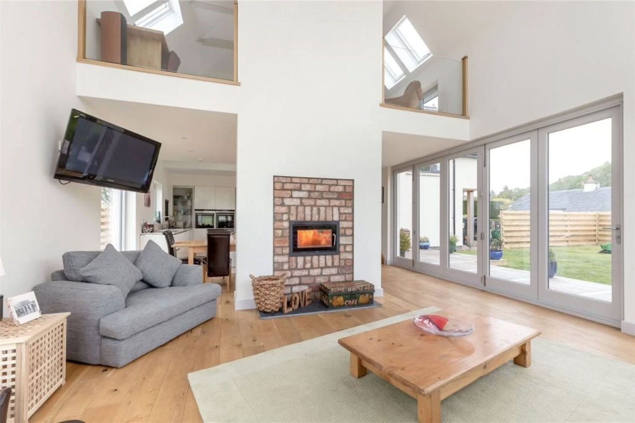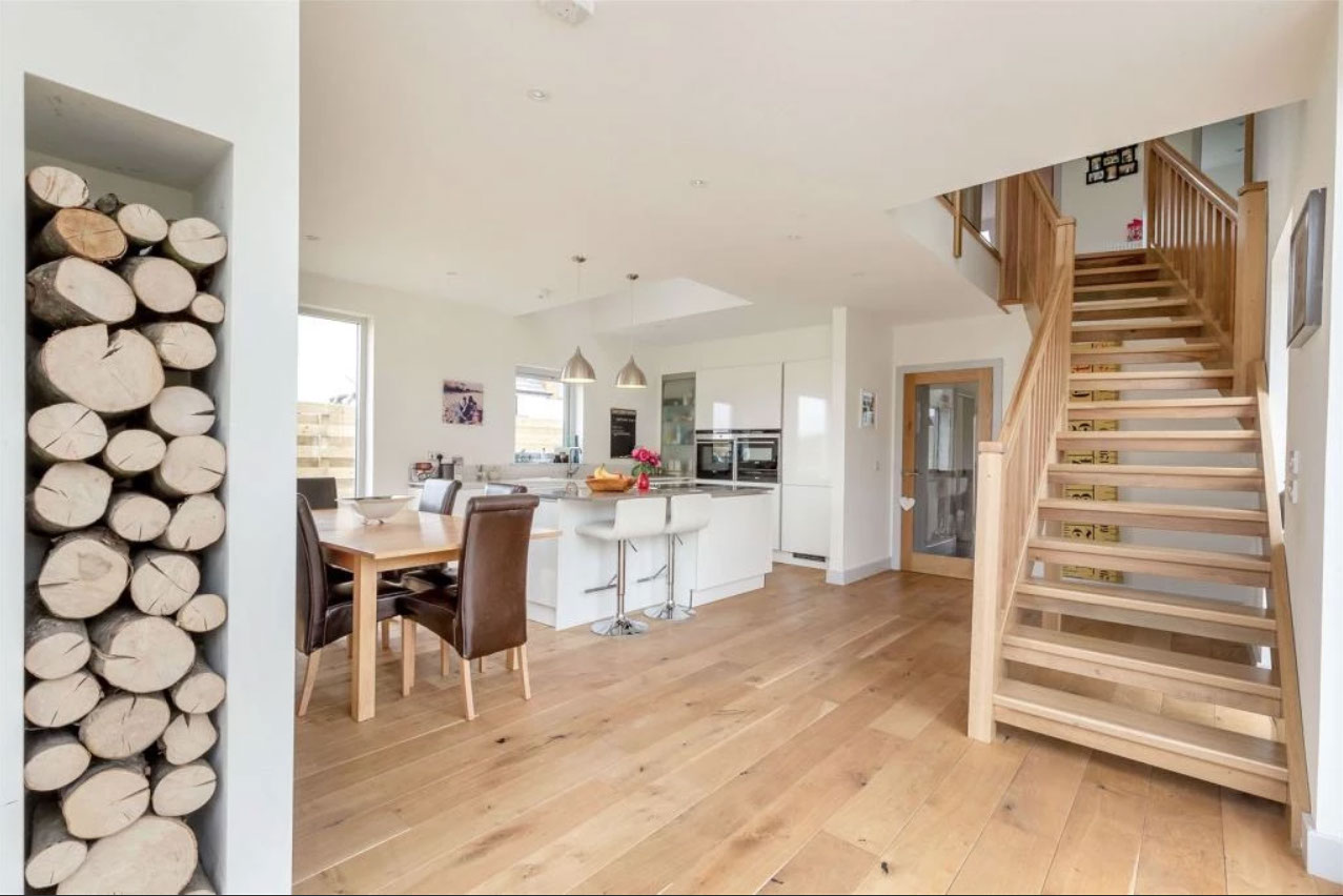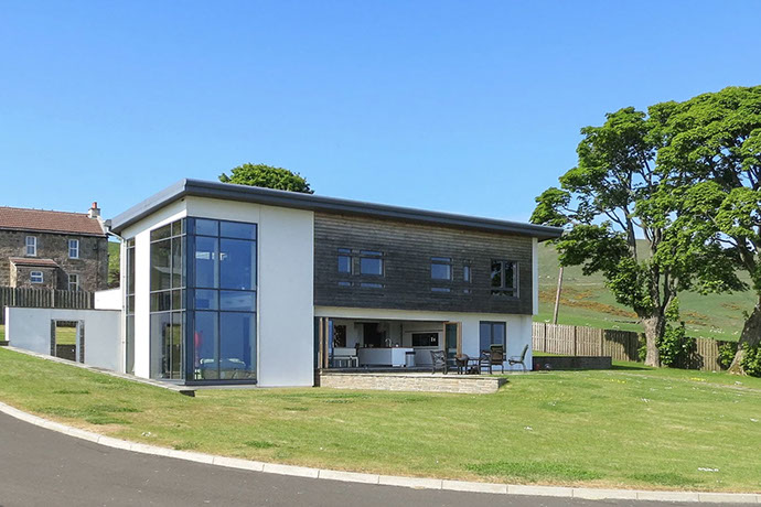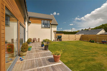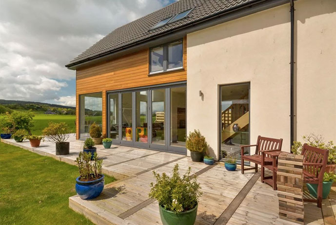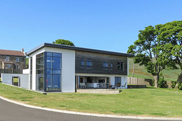 Dunedin is a contemporary modern family home. It has a steel and timber frame clad with smooth render and timber lining. It has hardwood double glazed windows and a concrete tiled roof. The well designed accommodation is tastefully presented with high quality fixtures and fittings throughout including oak doors and an oak and walnut staircase. The kitchen has an island and integrated appliances and the sitting room has a vaulted ceiling and a log burning stove open to both the sitting room and the kitchen and dining area. Bi fold doors lead out to a large decked seating patio.