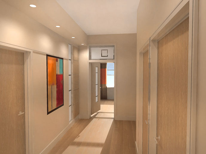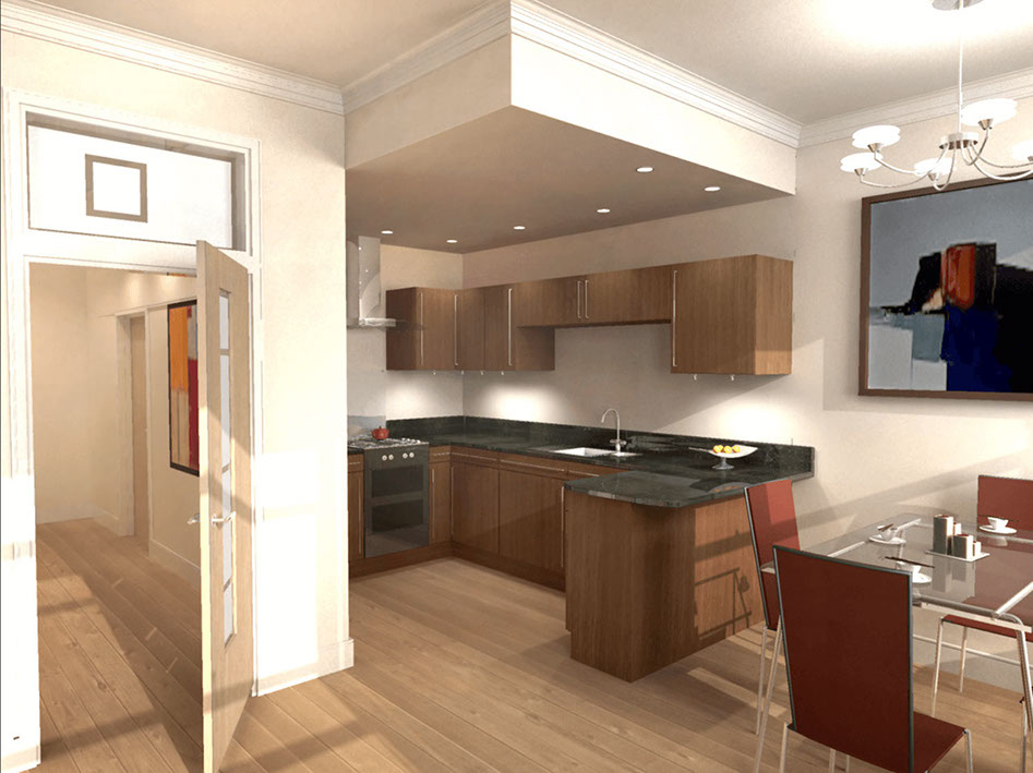 The parameter and drivers of the design were to build luxury, contemporary flats within a shell that reflected the adjacent properties. The adjacent properties consisted of Grade A Listed Playfair villas and a stone fronted tenement block. The new flatted block had one flat per floor; a lift and a main stair which was vented through a large roof copula. The flats had an open plan living / dining/ kitchen and 2 bedrooms to the rear one with an ensuite bathroom.